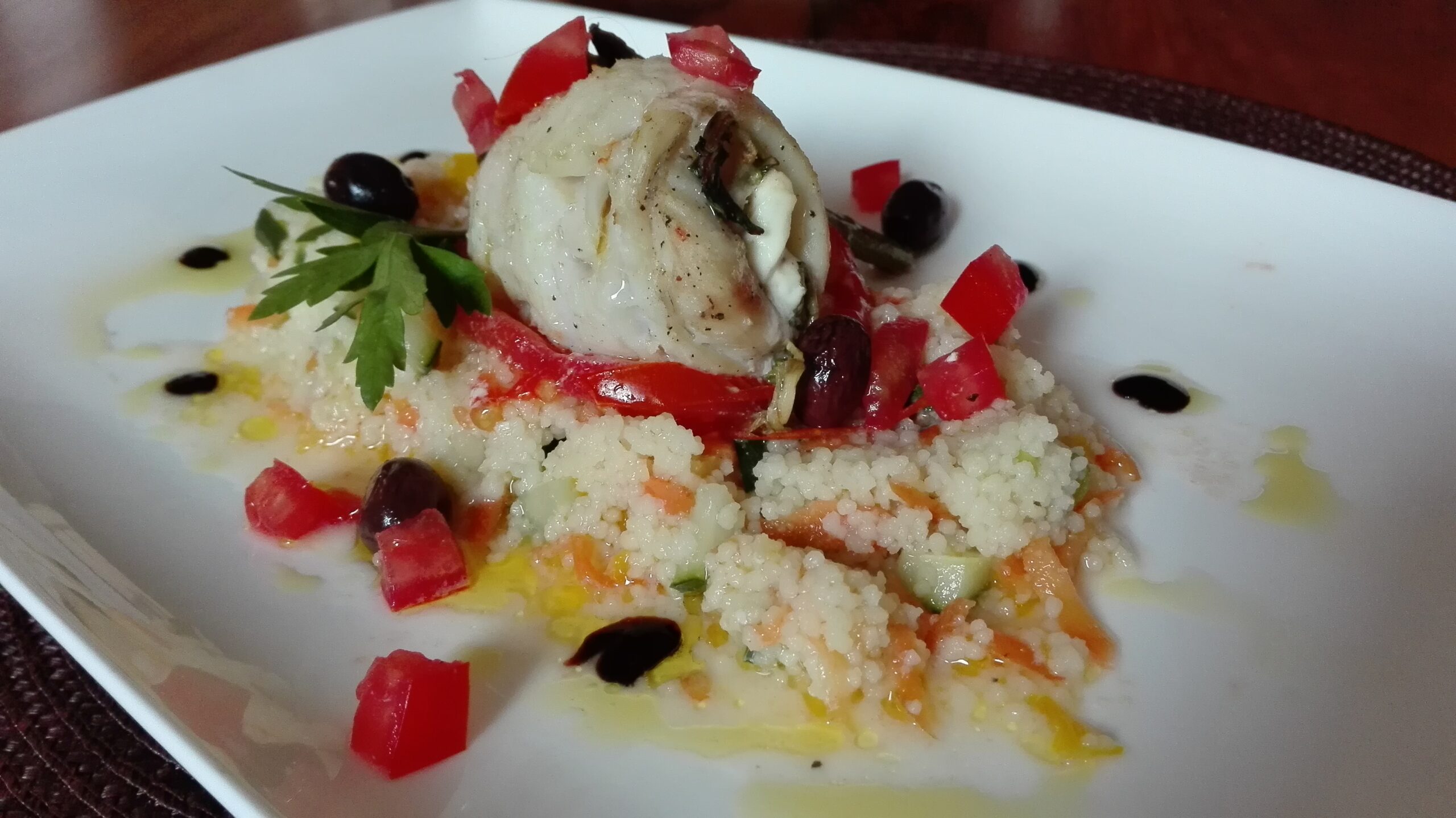 Lightly oil casserole dish. Line with 8 slices of tomato. Place the four (4) pieces of tilapia on a cutting board, sprinkle with salt and pepper. Put one (1) piece of feta 1 inch/2.5cm from the wider end of each fillet. Roll up starting from the wider end. Secure each filet with a toothpick and stand up in a casserole dish on tomato. Top each roll with tomato slice, and sprinkle with olives. Combine remaining ingredients until well blended. Pour over fish and cover with aluminum foil. Place the casserole dish in a preheated oven. Bake for 10 minutes. Remove foil and bake for another 10 – 12 minutes.